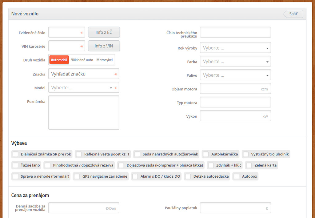 Po vyplnení a uložení formuláru sa auto pridá do zoznamu vozidiel. Následne môžete auto prenajať konkrétnemu zákazníkovi. Cez ikonku +